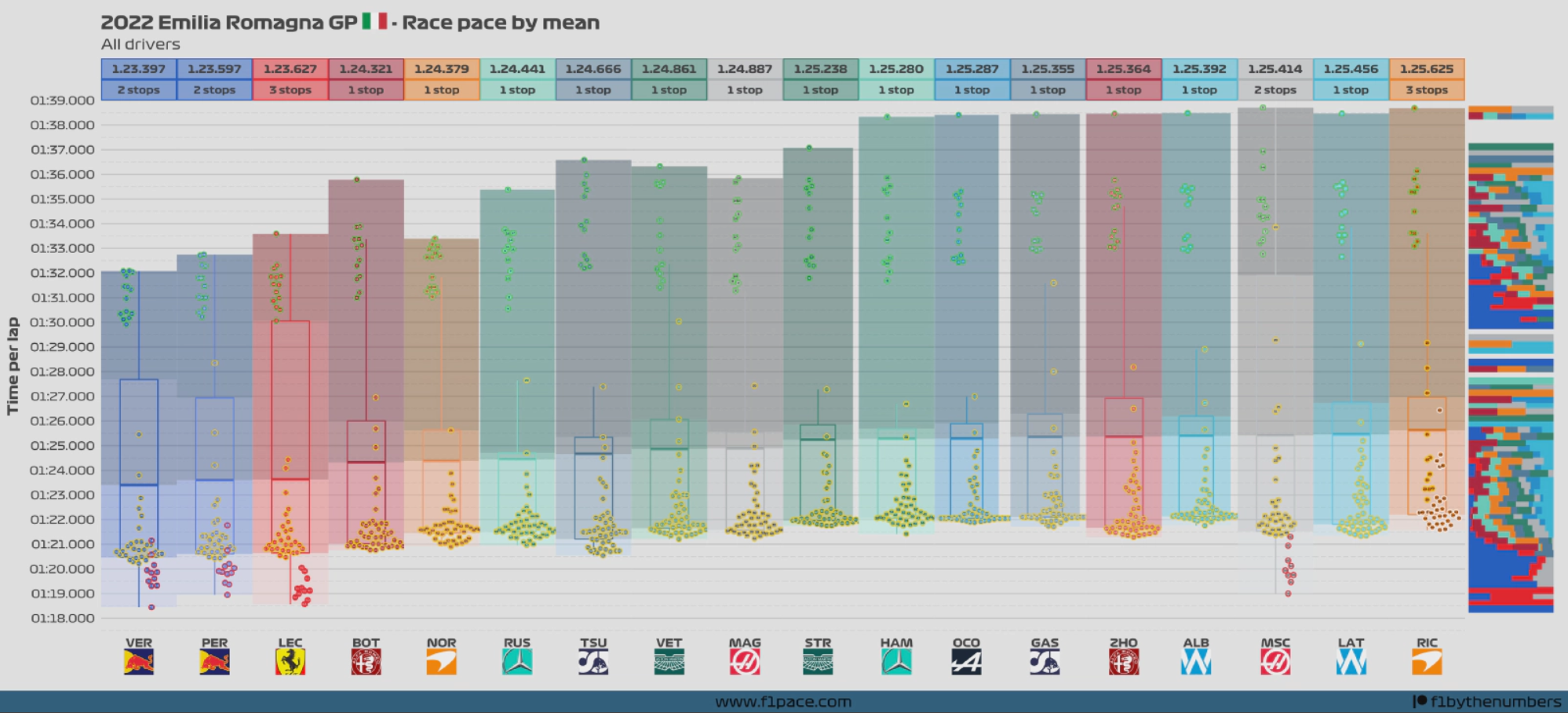 (注:图片上方为车手本场比赛的平均圈速,下方为圈速区间及每一圈的具体速度。本图未计入安全车带领下的圈速。右边的色块栏表示每支车队在0.250秒内完成圈数的百分比。)