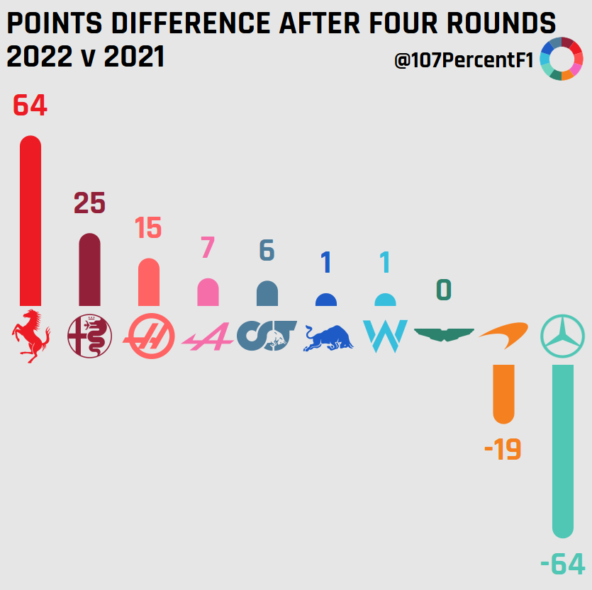 本图为上赛季前四站与本赛季前四站各车队的积分变化。使用法拉利引擎的车队:法拉利、阿尔法·罗密欧、哈斯,成为了进步最大的3支车队(上赛季的前四场比赛中不含有冲刺赛)