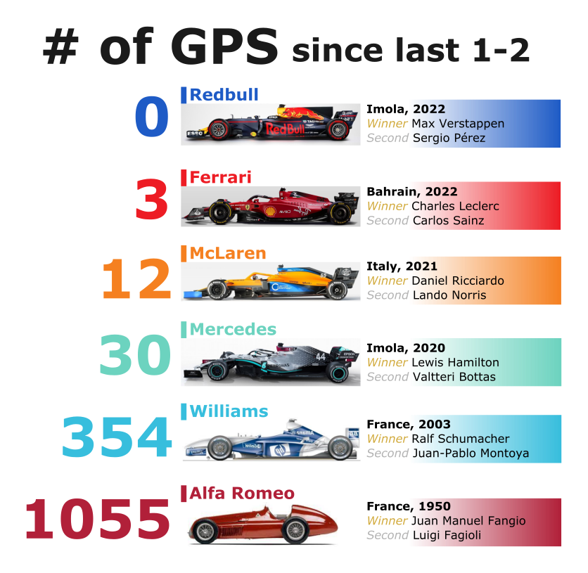 艾米莉亚罗马涅大奖赛,红牛车队一、二带回。有网站统计了各车队最近一次包揽前两名的时间。其中,迈凯伦车队上一次一、二带回是在2021赛季的蒙扎,里卡多夺冠,诺里斯获得第二,他们也成为了那个赛季唯一一支包揽前两名的车队。而梅赛德斯奔驰车队最近的一次正好是2020年的伊莫拉,汉密尔顿和博塔斯分获第一、第二。阿尔法·罗密欧车队上一次获得前两名还要追溯到1950年的法国站。从那时起到现在,已经经过了1055场大奖赛。