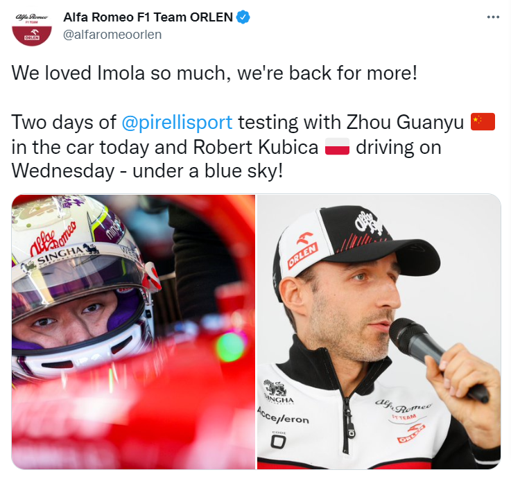 阿尔法罗密欧将在伊莫拉进行为期两天的倍耐力2023轮胎的测试,周冠宇今天参加测试,明天是库比卡。