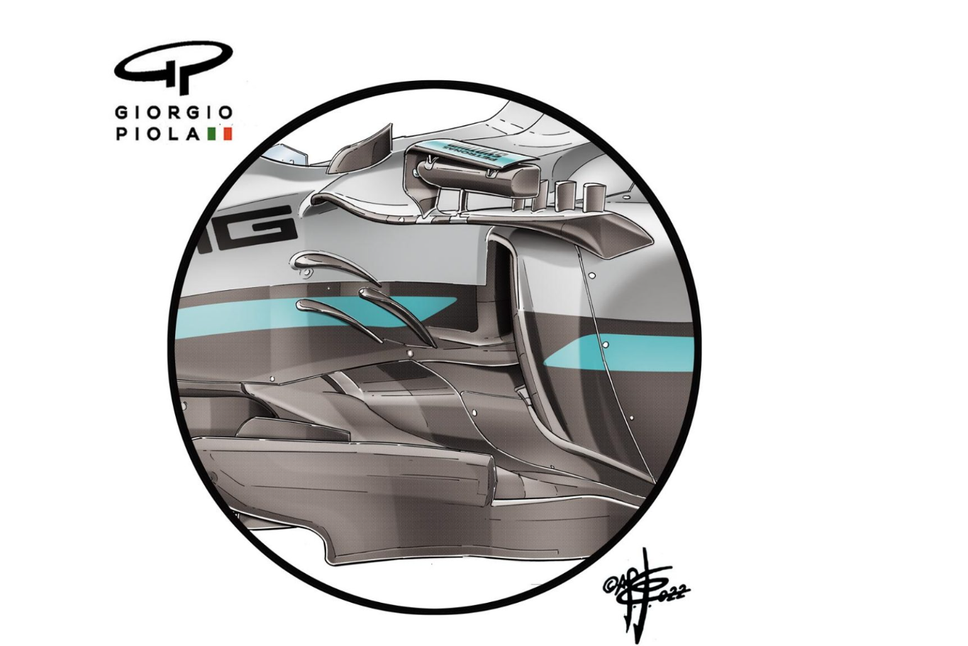 (梅赛德斯的散热器入口前加了一个新的导流板,并且在后视镜支架附近加了一个新定型防护罩,这些都与“海豚跳”问题无关,只是一系列小型空气动力学升级的一部分。)