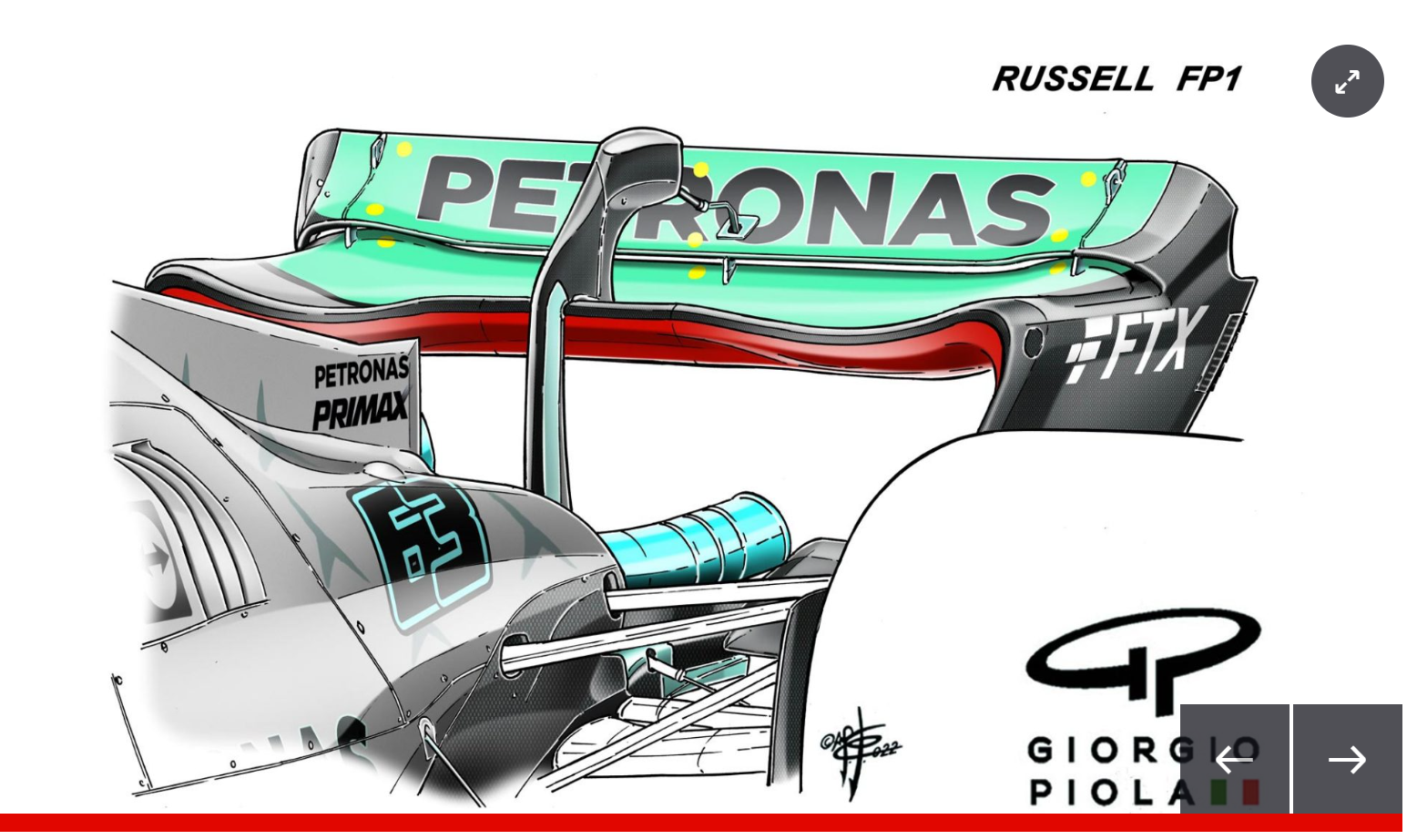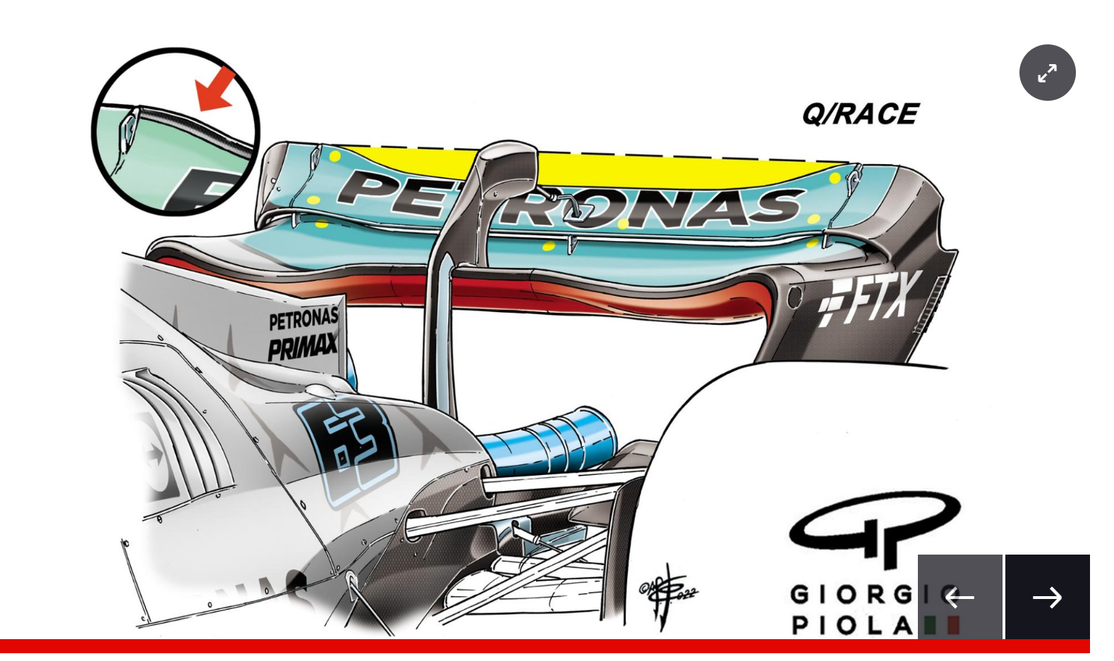 (但是像刘易斯 · 汉密尔顿一样,拉塞尔之后选择了下压力较低的版本,与汉密尔顿不同的是,拉塞尔在尾部边缘有一个挡板,只需增加一点阻力,就可以获得更大的下压力。)