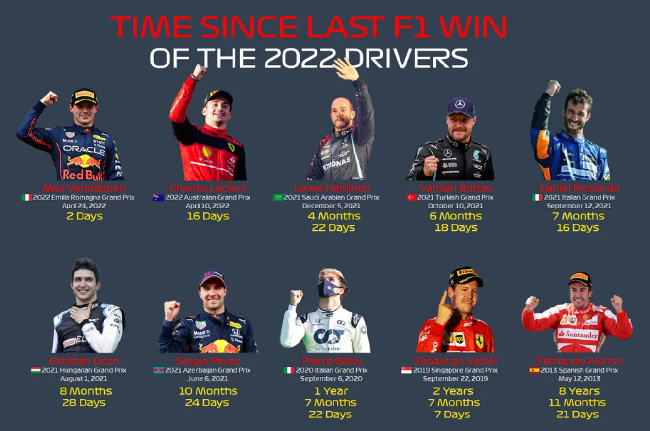 目前围场内的20位车手中有10位曾经获得过分站冠军。其中,维斯塔潘距离上一次分站冠军时间最短,也就是2天前的伊莫拉。而时间最长的车手是费尔南多·阿隆索,他上一次获得分站冠军是在2013年的西班牙大奖赛,距离此时已经过去了8年11个月21天。