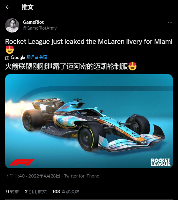 游戏博主GameRiot更新推特:游戏火箭联盟疑似把迈凯伦的迈阿密站涂装提前泄露。