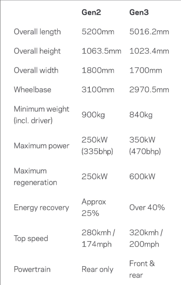 Reddit网友列出了FE Gen2与Gen3的数据差异。分别从赛车长度、高度、宽度、轴距、最低重量(含车手)、最大功率、能量回收比例、极速、驱动形式方面做了比较。