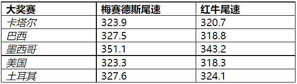 梅赛德斯方面自然坚决否定了霍纳的言论。让我们先用事实和数据说话,看看最近几场比赛红牛和梅奔最快尾速的对比。