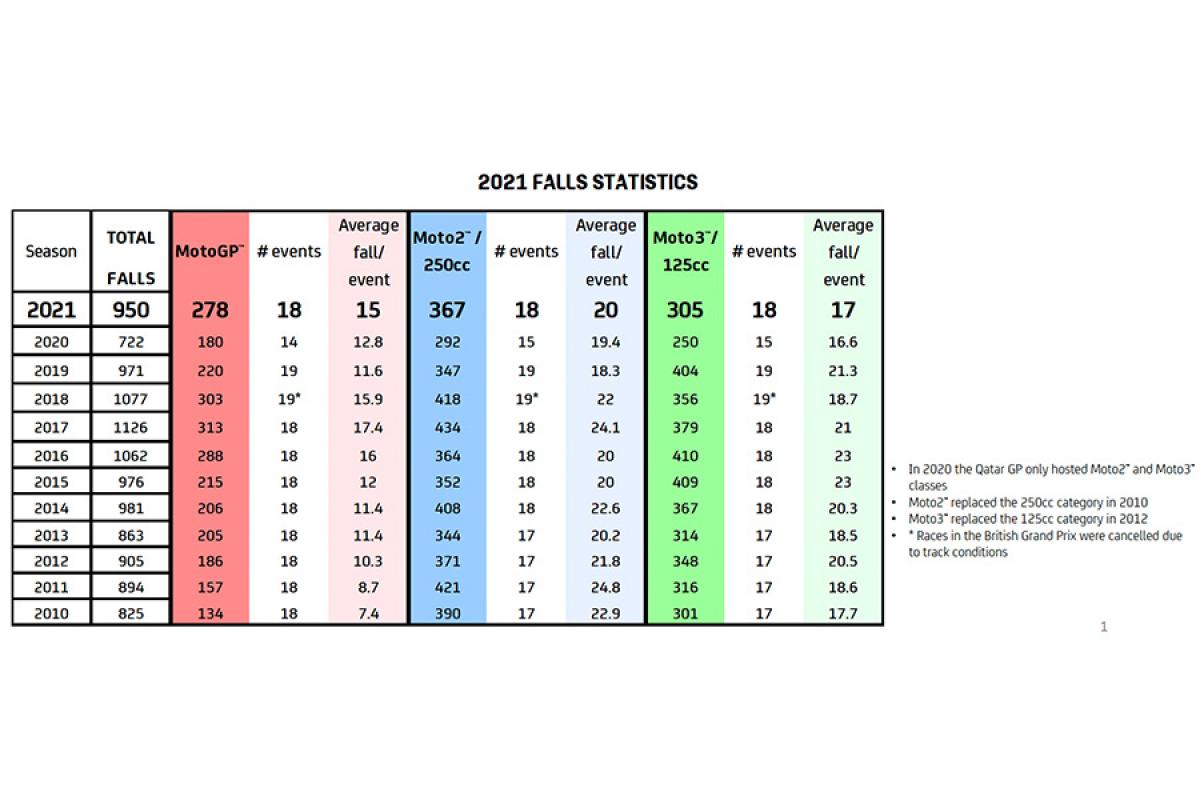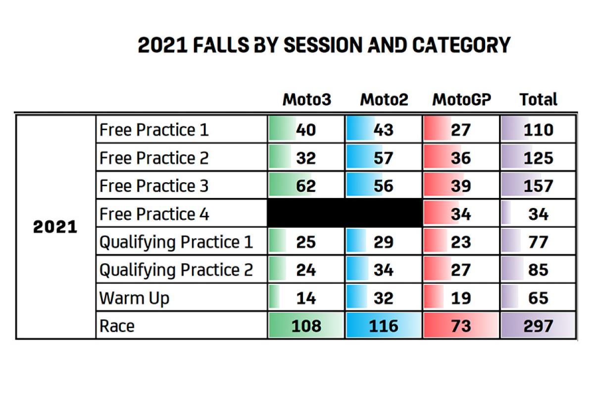 把因疫情原因缩短的2020赛季排除在外,本赛季是自2014年以来车手摔车总数最少的一年。三个组别的车手累计出现了950次摔车,其中,Moto 2组别贡献了最多的367次,GP组别的数据则是最少的278次。