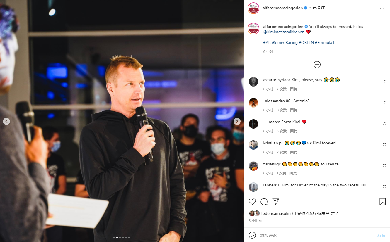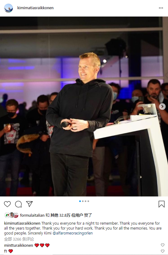 莱科宁也在社交媒体上写到:感谢今晚的每一个人,感谢这些年的每一个人,感谢大家的辛勤工作,感谢带来的所有记忆。你们都是很好的人。