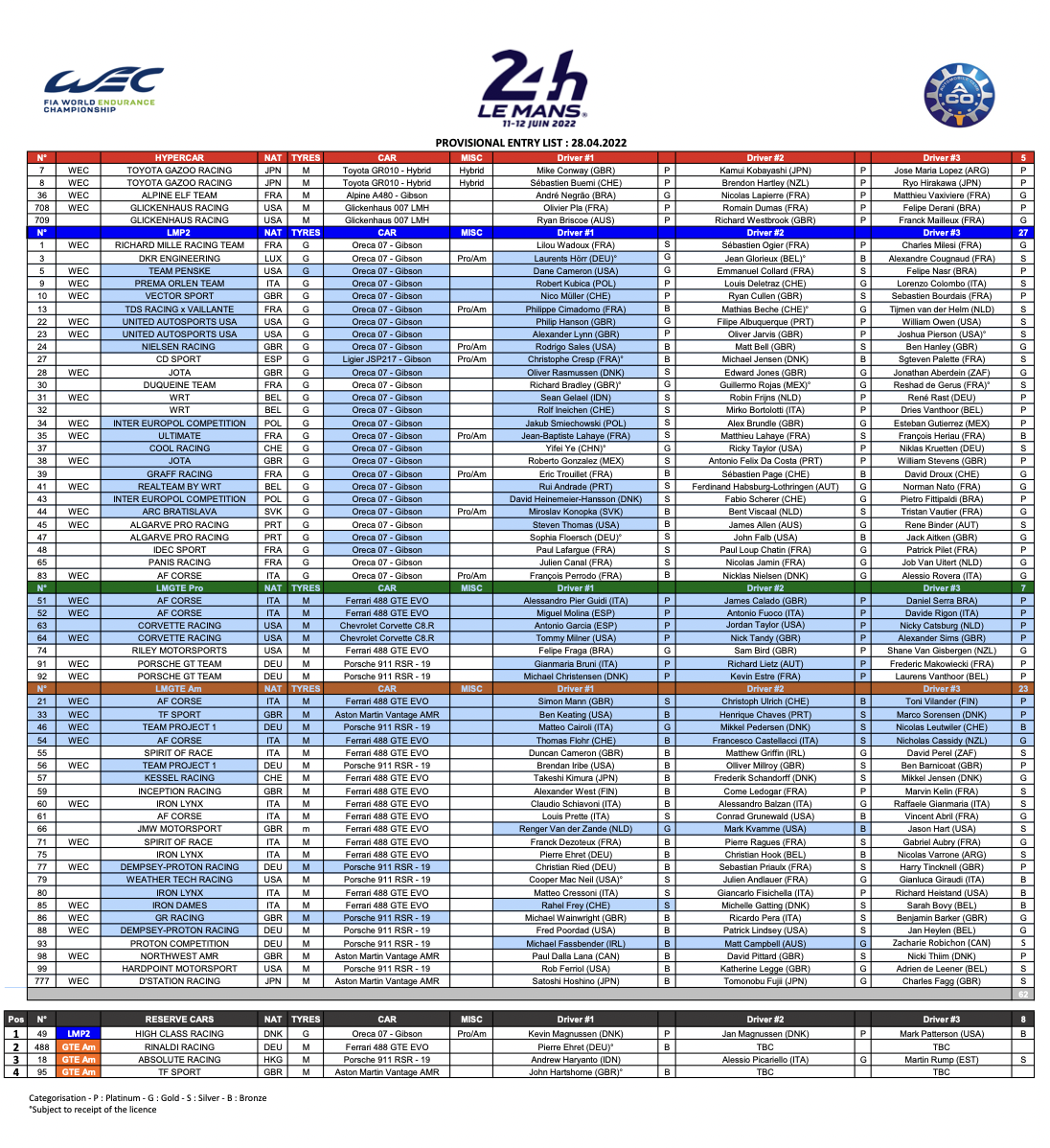 在官方公布的第90届勒芒24小时耐力赛名单中,共有62台赛车、186名车手参与四大组别的比赛。今年的勒芒24小时将于6月11-12日进行。