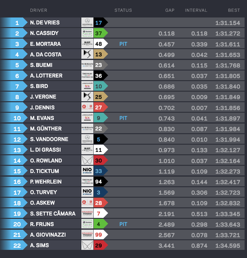 FE摩纳哥站第一次练习赛结束,最终德弗里斯以1:31.154排名第一,卡西迪和莫塔拉排名二三。去年在这里夺冠的达科斯塔排在第四。