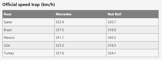 从数据表里能清晰地看到梅赛德斯在5条赛道的极速都比红牛更快。