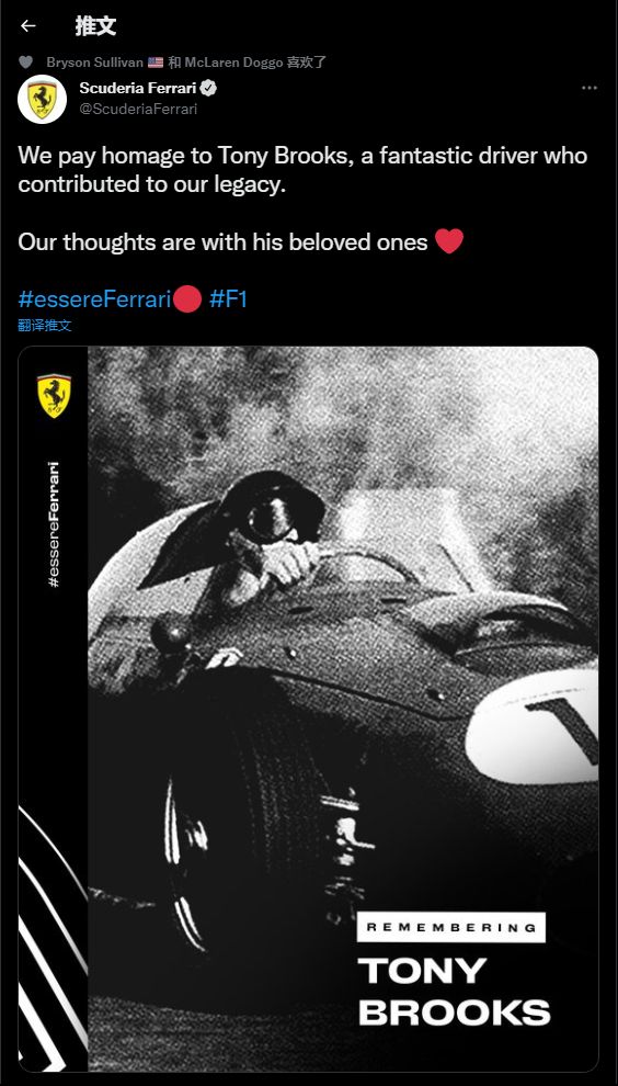 法拉利车队在其官方推特上写道:我们向托尼·布鲁克斯致敬,他是一位出色的车手,为我们的传奇做了巨大的贡献。