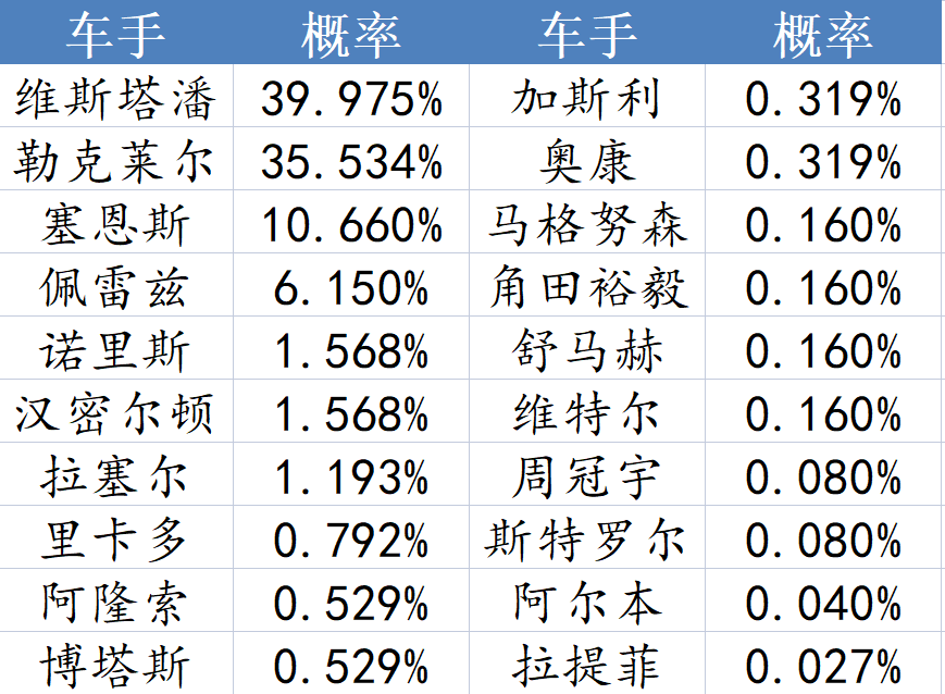 其次是法拉利的另一位车手塞恩斯,概率为10.660%;