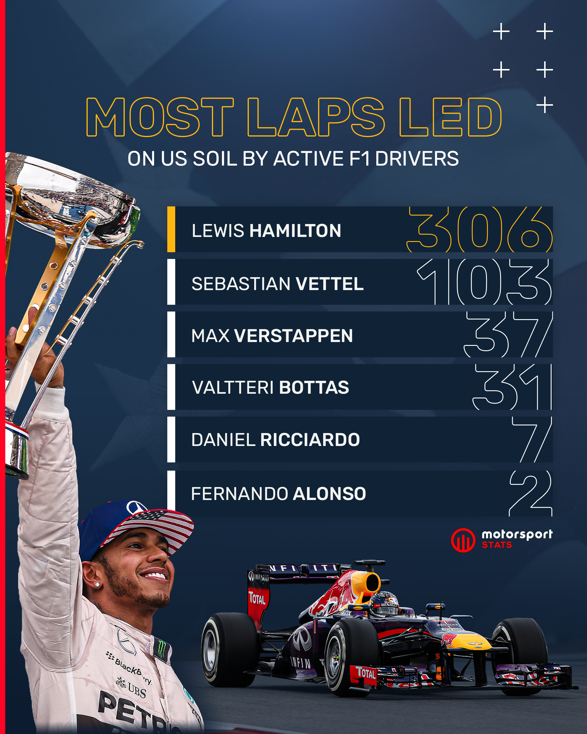 据Motorsport Stats的统计,汉密尔顿总共在美国本土大奖赛上领跑306圈,是现役任何车手的两倍以上,第二名维特尔在美国本土比赛上领跑过103圈。此外,汉密尔顿还在美国比赛上6次取胜。