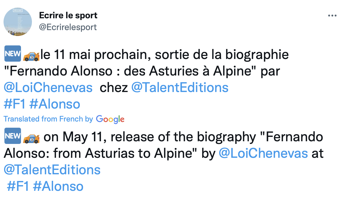 据Ecrire le sport报道,由记者Loïc Chenevas-Paule撰写的阿隆索传记《费尔南多阿隆索:从阿斯图里亚斯到Alpine》(Fernando Alonso: from Asturias to Alpine)将于5月11日出版。阿斯图里亚斯是阿隆索的出生地。