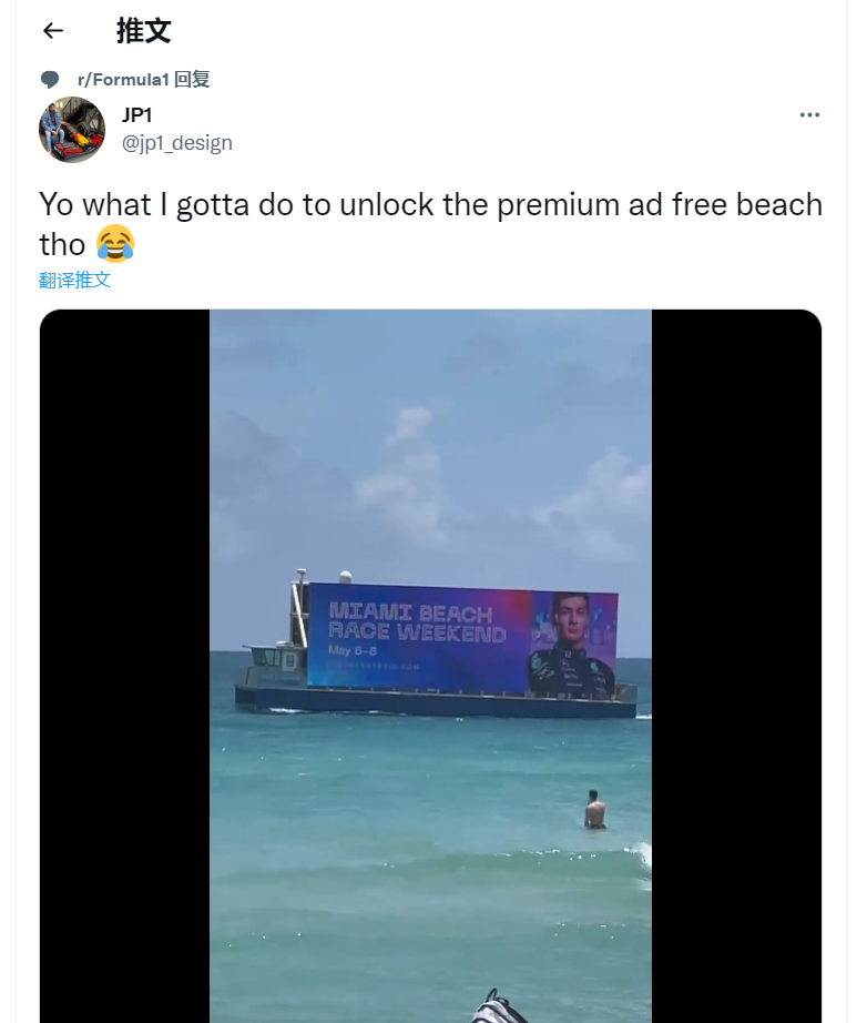 推特网友分享了在迈阿密海滩看到的大奖赛宣传,实在是意想不到。