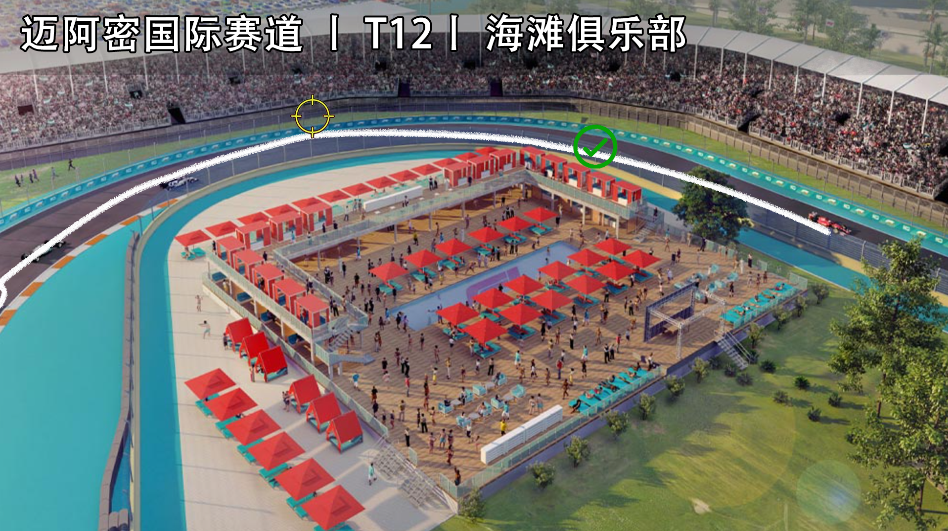 第二计时段的特色弯角与游艇码头神似,迈阿密海滩俱乐部同样也是这座城市异域风情在赛道上的复刻。为了这座贵宾观赛区能有最佳的视野,T11拥有全场最佳超车点,以及环绕式的T12-14布局使得这个路段的线路选择多样化。其中T12这个连续向右的弯角允许车手们采用内外内的常规路线,但倘若在正赛中尝试一把紧贴内线的驾驶方式,亦有可能对前车造成攻势。