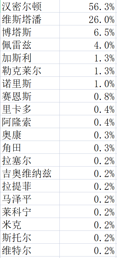 其他的车手夺冠概率都为个位数,甚至更低。3到7位是博塔斯、佩雷兹、加斯利、勒克莱尔、诺里斯分别为6.5%、4.0%、1.3%、1.3%、1.3%。