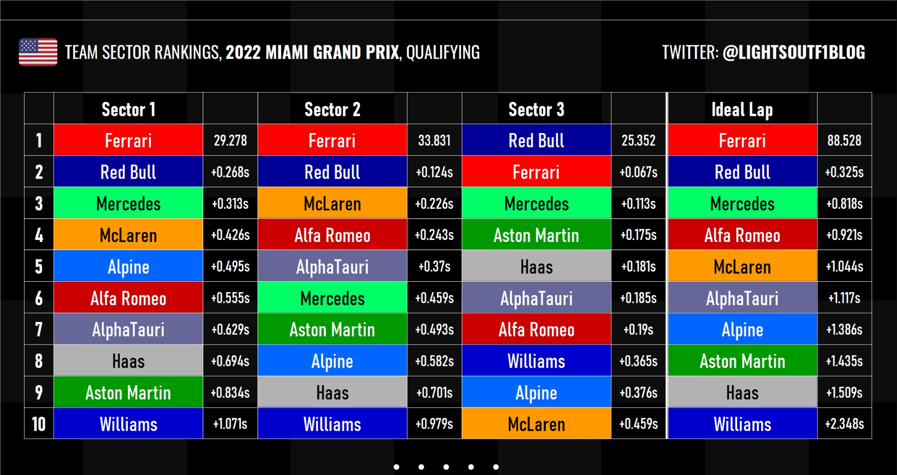 根据赛车网站LightsOutBlog的数据,法拉利在赛道的一二段表现及其强势。在排位赛中,单圈可快红牛到0.325秒。
