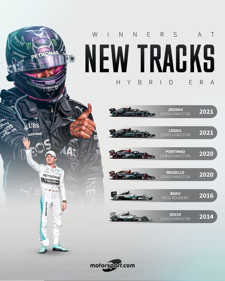 梅赛德斯自过往以来,可以说是新赛道上的霸主。从混动纪元开始,汉密尔顿分别拿下了吉达、卡塔尔、波尔蒂芒、穆杰罗赛道的冠军;而罗森博格也在2016年的巴库有一次新赛道冠军入账。