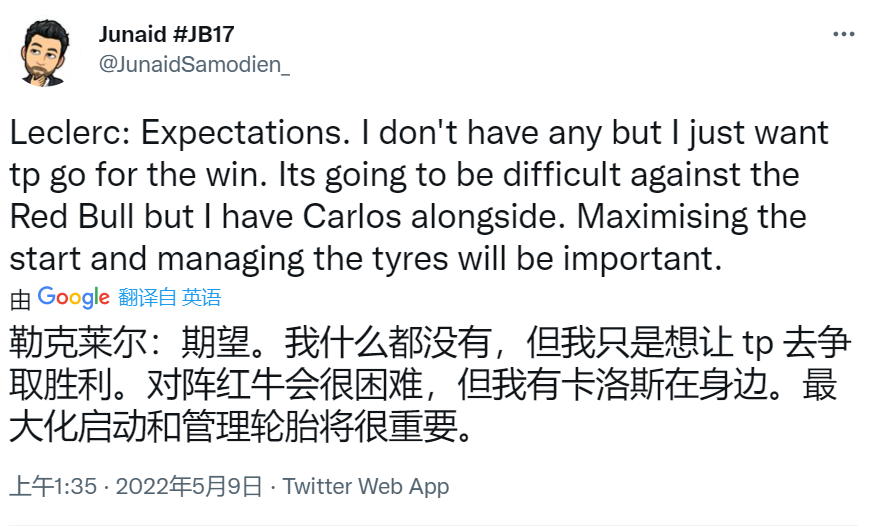 勒克莱尔赛前的车手巡游中说:我只想赢得冠军。对阵红牛会很困难,但我有赛恩斯在身边(帮我)。好的起步和管理轮胎对夺冠很重要。