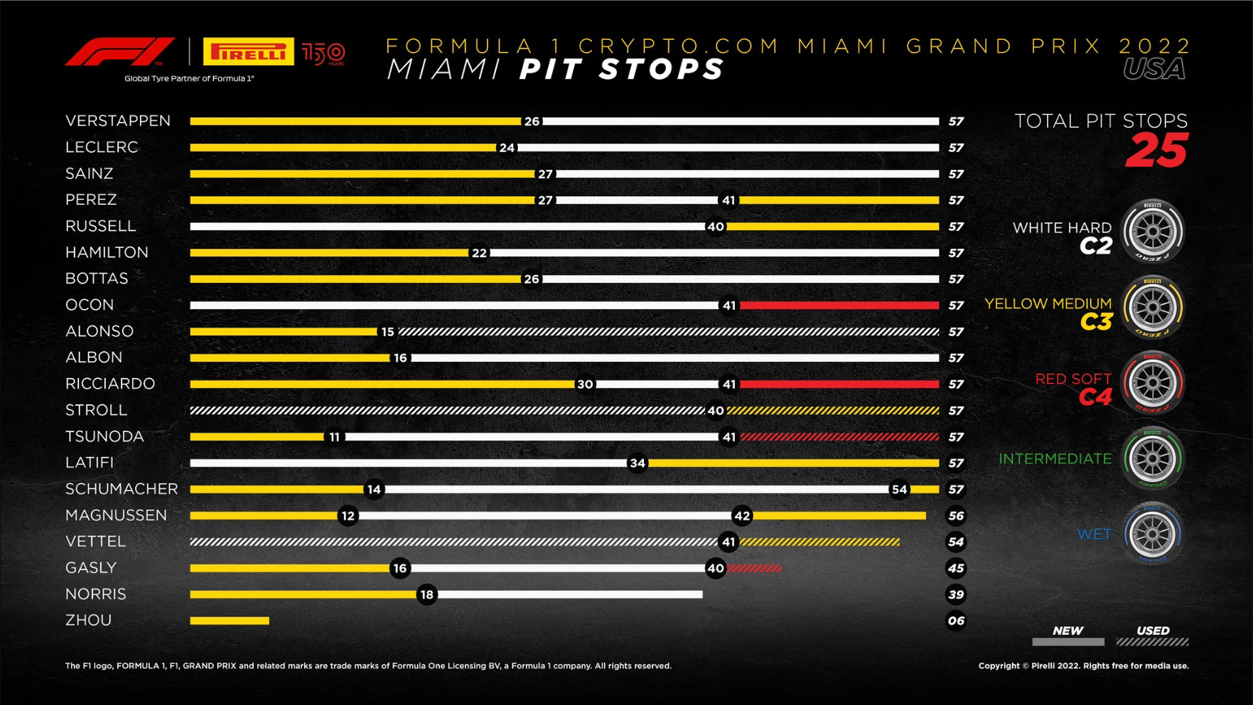 倍耐力公布了今晨结束的迈阿密大奖赛所有车手轮胎使用情况,登上领奖台的三位车手都选择了1停。