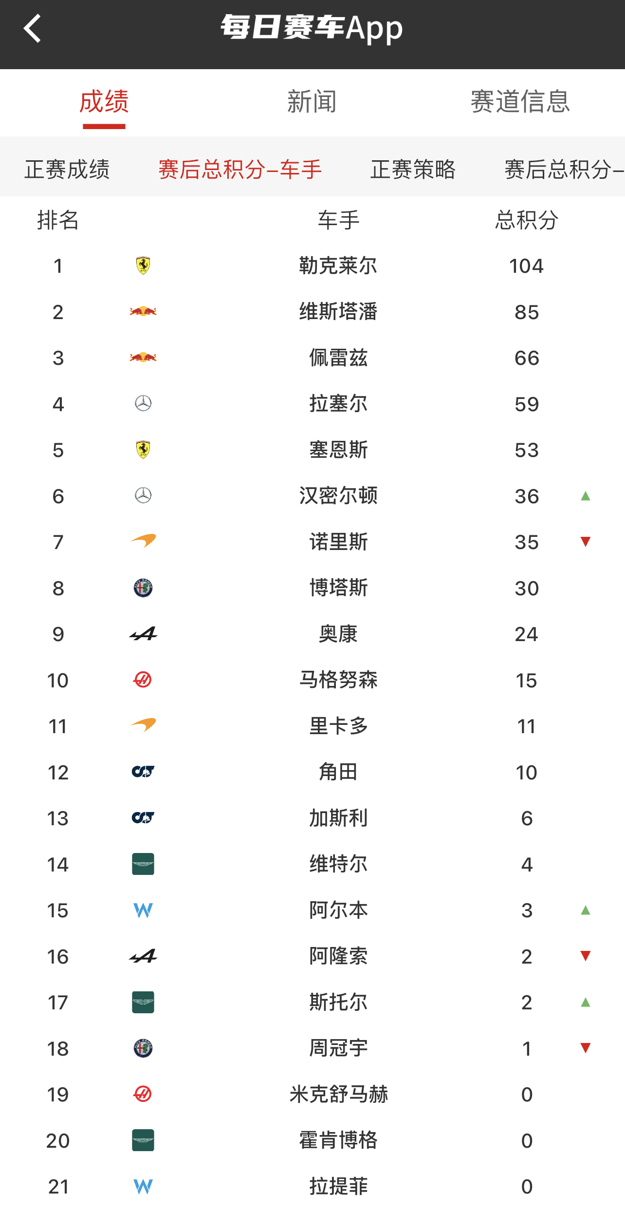 在今晨迈阿密大奖赛夺冠的维斯塔潘拿满了本场比赛的26个积分,这也让他在车手积分榜进一步逼近了领头羊勒克莱尔。目前双方的分差仅有19分。