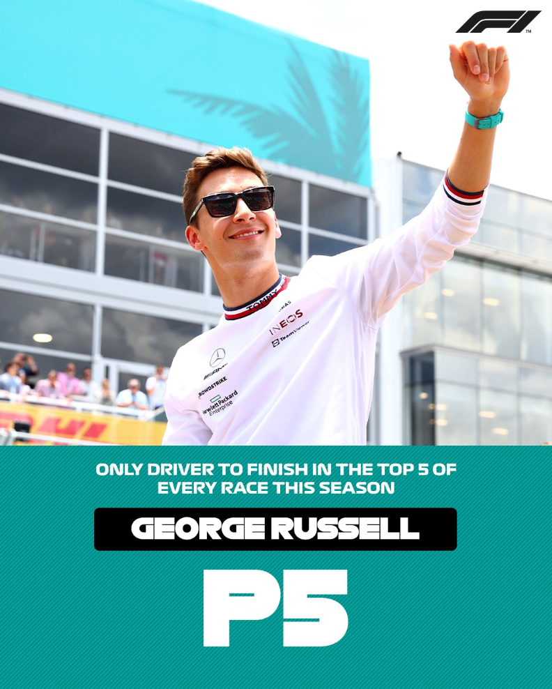 随着拉塞尔本场比赛的强势表现,从排位赛第12名本场比赛一路上到第5名,他也成为了本赛季唯一一位所有比赛都能进入前五的车手。