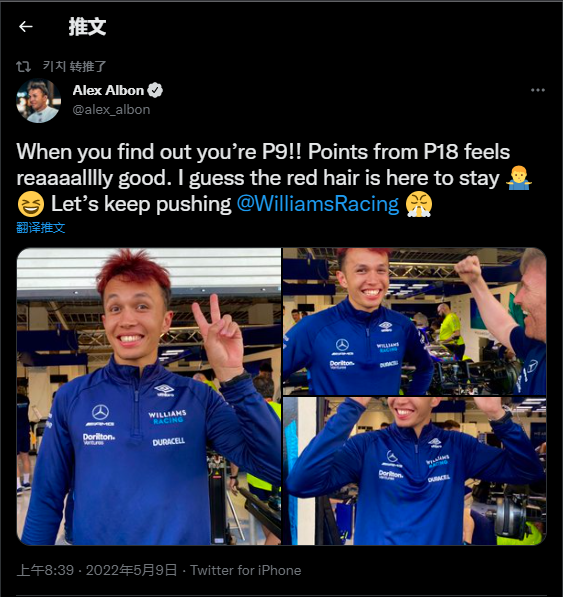 阿尔本在迈阿密大奖赛后更新了个人推特:当你从第18发车到第9完赛真是太好了!我想我得留住我这一头红毛了,继续加油!