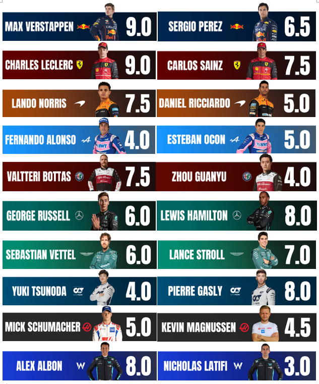 The Race给出了迈阿密站车手评分:冠军维斯塔潘和杆位出发的勒克莱尔拿到了最高的9.0分,拉提菲拿到最低的3.0分。周冠宇4.0分,汉密尔顿、加斯利、阿尔本8.0分,博塔斯、诺里斯、塞恩斯7.5分。