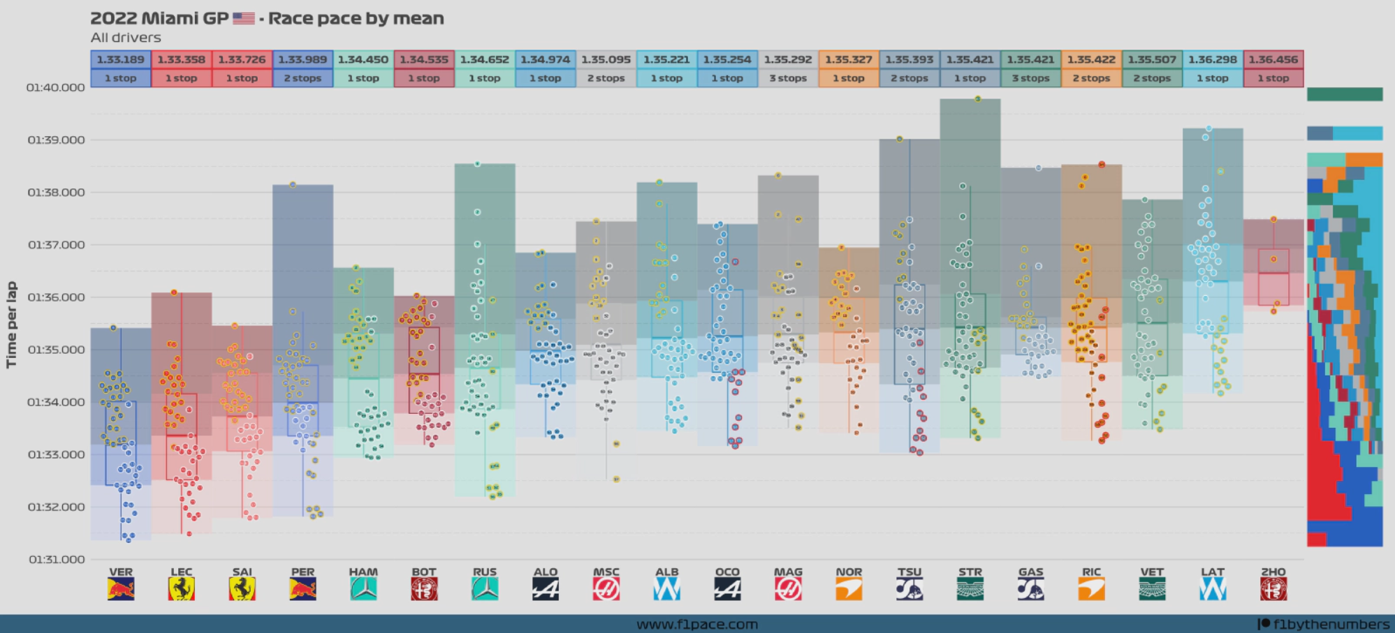 本场比赛前四位车手的平均圈速非常接近:维斯塔潘1次进站,以1:33.189的平均圈速位列第一;勒克莱尔同样是1次进站,以1:33.726的平均速度紧随其后;塞恩斯1:33.726;佩雷兹两次进站,平均圈速也达到了1:33.989;