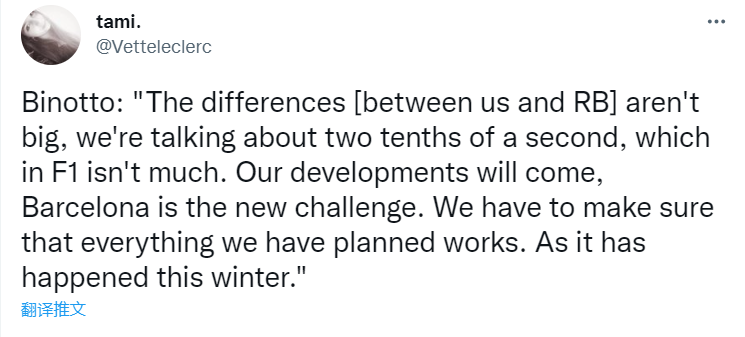 比诺托:“我们和红牛的差距大约是0.2s,对于F1来说并不算大。我们会有升级的,巴塞罗那是新的挑战。我们需要确保一切按计划进行,就像去年冬天一样。”