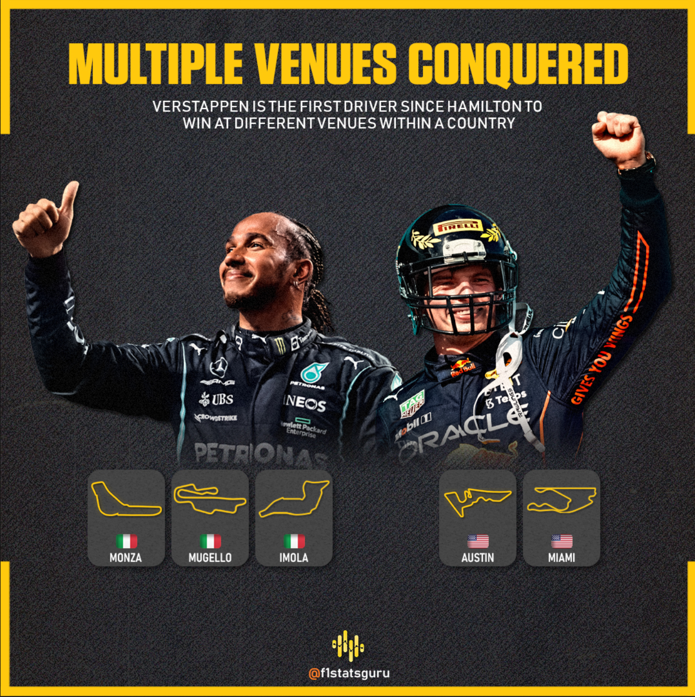 维斯塔潘获得了迈阿密大奖赛的冠军,加上之前的奥斯汀大奖赛,维斯塔潘成为了继汉密尔顿之后,又一位在同一国家赢下多场大奖赛的车手。