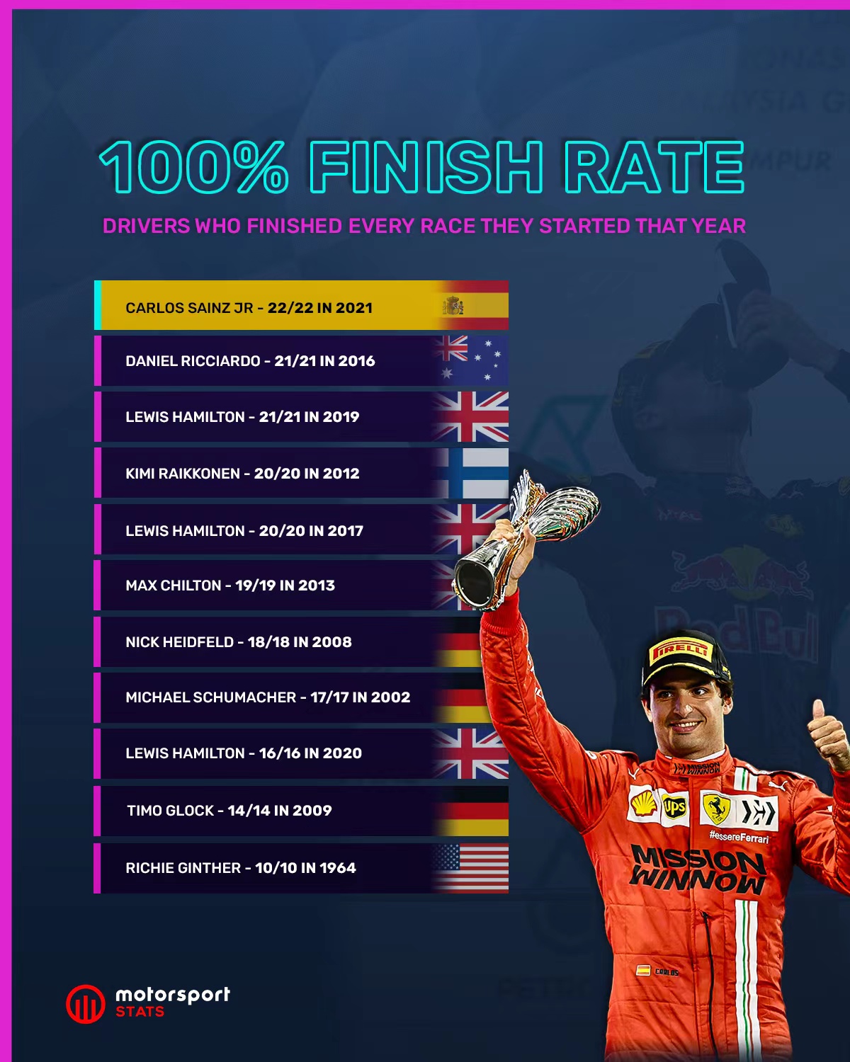 F1历史上一共出现过11位单赛季参加的所有比赛都能完赛的车手,距离最近的是上个赛季的塞恩斯,他参加了22场大奖赛,均顺利完赛。汉密尔顿也曾多次做到这一点,今年还会出现这样的车手吗?