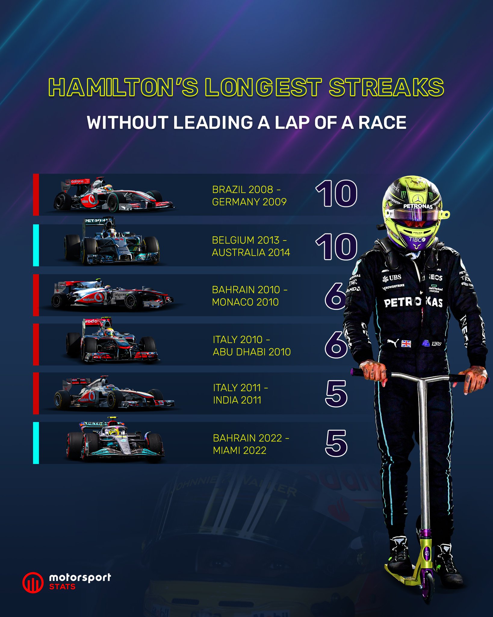 外媒也统计了汉密尔顿了连续未领跑记录: