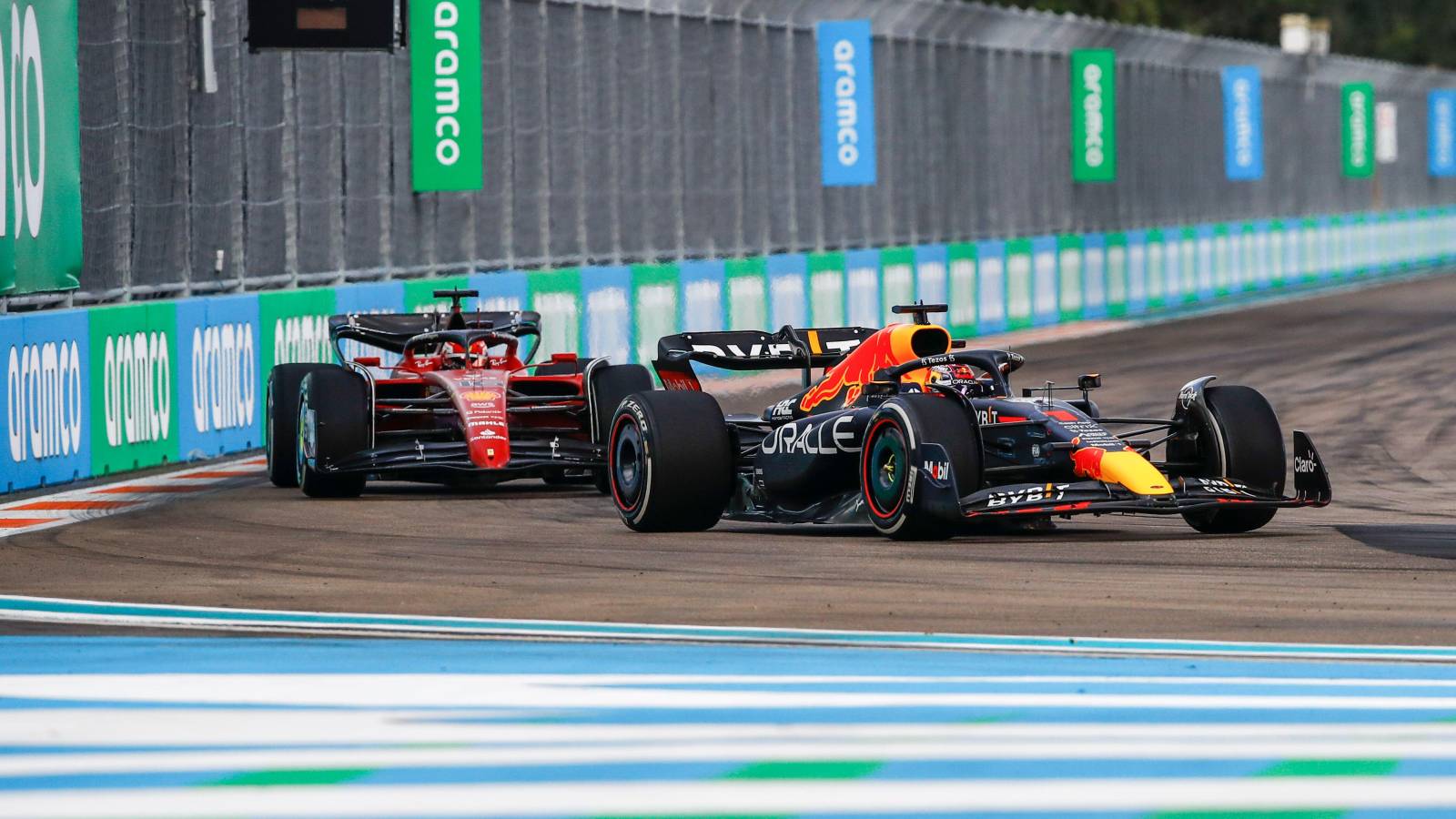 迈阿密正赛上,勒克莱尔从杆位出发,刚开始几圈明显比维斯塔潘有速度上的优势,而维斯塔潘在起跑后超越身前塞恩斯,上升至全场第2名。