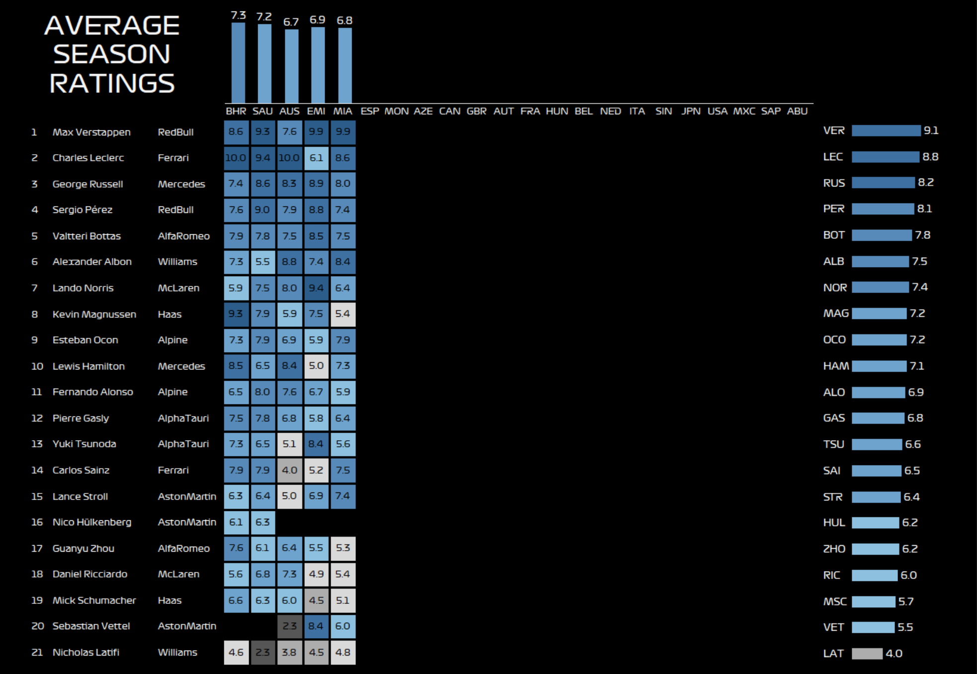 维斯塔潘平均得分为9.1分,力压平均分为8.8的勒克莱尔暂列榜首。中国车手周冠宇排名并列第16位,平均评分为6.2。威廉姆斯车手拉提菲排名垫底,平均分为4.8,其每场比赛的评分在各个网站都没有超过5分。
