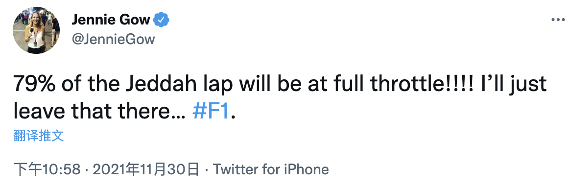 著名英国赛车媒体人Jennie Gow今天在推特上说:我就把话撂这了,吉达滨海赛道79%都是全油门路段……