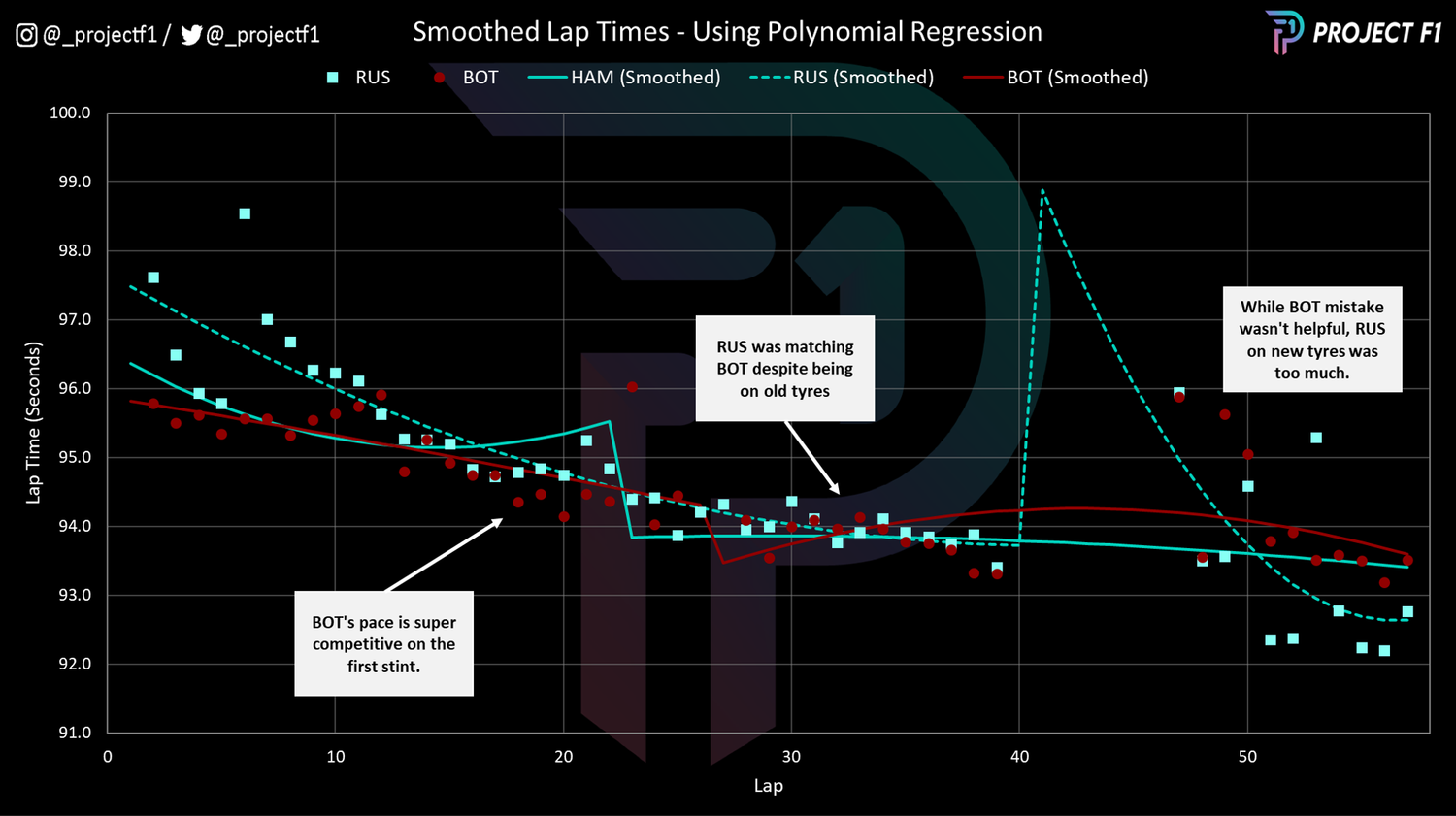 汉密尔顿在白胎的第二个stint追上了博塔斯。图 1 中的另一个重要信息是,尽管拉塞尔使用的是一套旧硬胎,但博塔斯无法缩小其差距。相反,表2告诉我们拉塞尔不断的在刷新自己越来越快的单圈成绩,并且可以与博塔斯的新胎持平。这个可以归结为,轮胎在伴随着胎压计和燃油燃烧的情况下表现更好-这个可以通过斯托尔,奥康和维特尔的数据看出来。