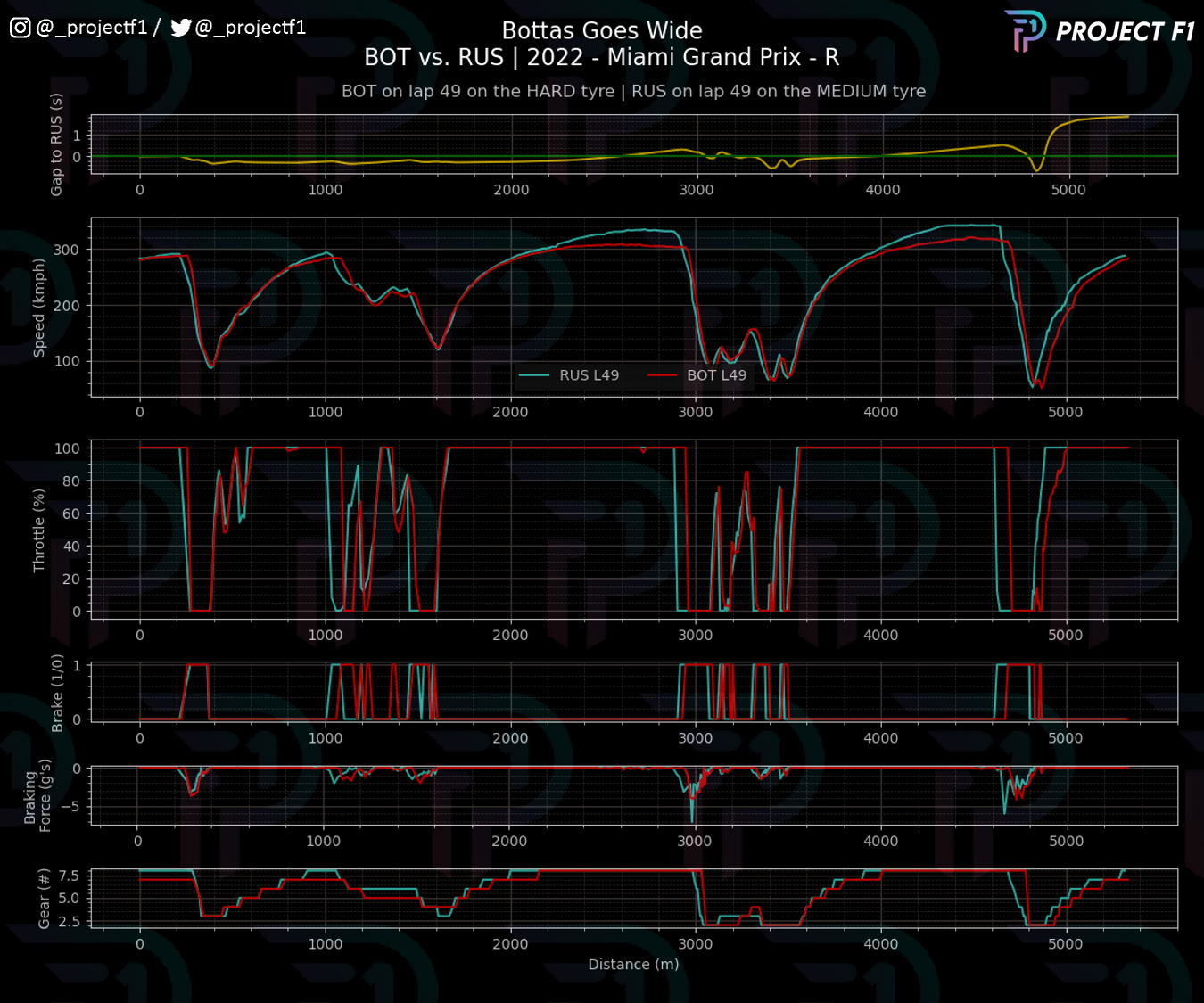 但红牛和阿尔法罗密欧的速度差异意味着这将是短暂的。 第 49 圈,博塔斯在第 17 号弯出弯的时候让赛车减速到了足够深的位置。 博塔斯不得不离开油门并回拉赛车以避开墙壁。 对于紧随其后的汉密尔顿和拉塞尔来说,这机会可以说是有手就行。 由于阿尔法罗密欧缺少硬胎,博塔斯也已无能为力来挽回局面。 最后,第七完赛是一个很好的成绩——但肯定不如第五完美。