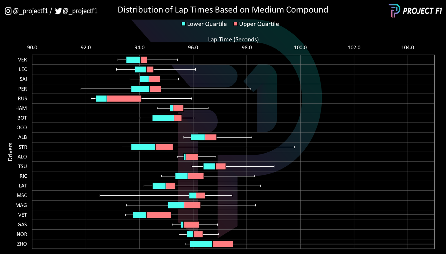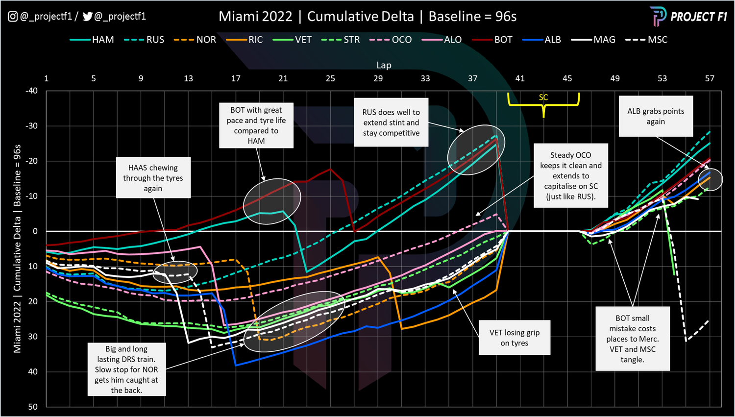 像往常一样,累积增量图(如上图所示)捕捉了上周末比赛的关键信息。该张图描述了许多中游车手的不同表现,一些车手在中性轮胎上的第一阶段表现出色,而其他车手则表现不佳。