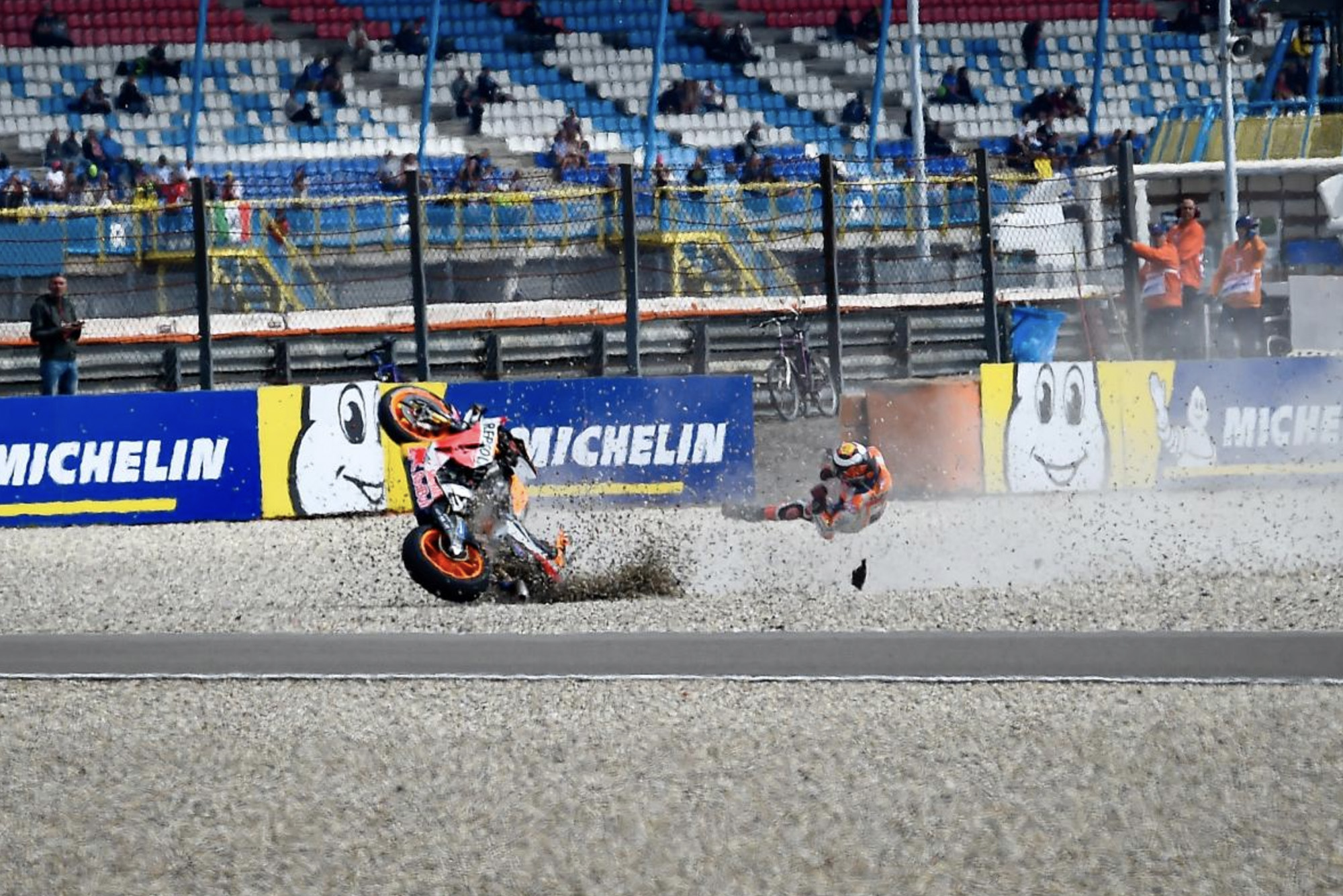 好在,大多数的摔车都发生在危险不大的情况下。本田车手通常是在过慢弯的时候失去控制, 赛道外一般也有足够大的缓冲区。例外的是,小埃斯帕加罗在瓦伦西亚站练习赛中的高速摔车足以迫使他缺席一整场比赛。