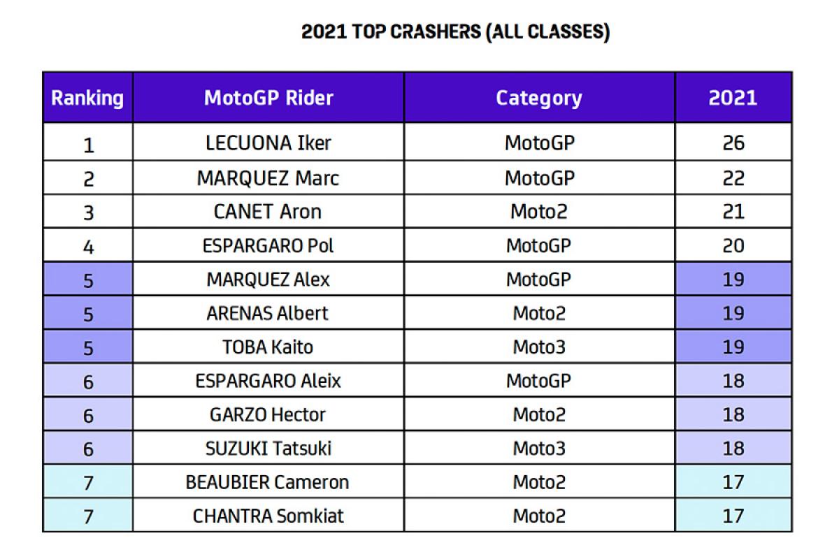 在2021赛季的278次摔车中,10%是由Tech3 KTM车队的车手伊克尔·勒库纳贡献的,这位年轻的西班牙车手在整个赛季的18场比赛中一共摔车26次,这在所有三个组别中都创下了新的纪录。