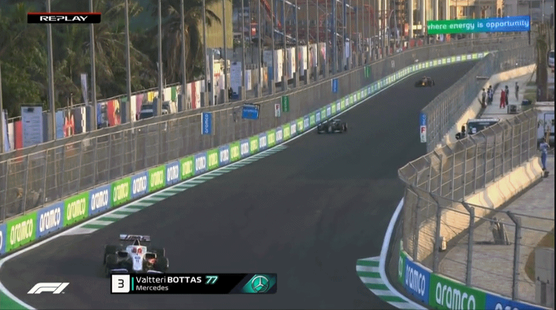 一练过程中,博塔斯在飞行圈中遭遇哈斯车队的慢车,芬兰人不得不减速避让,放弃单圈。可以看到,赛道略带倾角的13号弯相对狭窄,两车并排通过比较困难。