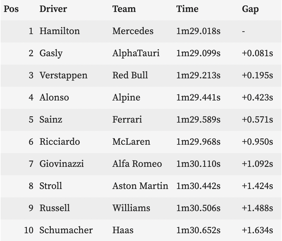 他的红胎最快圈在二练排在第四,位列汉密尔顿、博塔斯和加斯利身后。值得一提的是,维斯塔潘的红胎最快圈是在连续六圈中的第四圈做出的,加斯利的红胎最快圈是在第二圈做出的,而两位梅赛德斯车手由于交通问题(这也经常在FE中出现)都没有使用红胎做出最快圈,他们的最快圈都是用黄胎做出的。