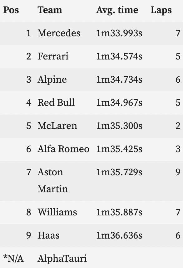 梅赛德斯表示:“单圈速度方面,我们其实更喜欢一练时的赛道情况,二练温度太低了,我们的车手找不到轮胎的抓地力,尤其是红胎。不过我们已经知道了一些解决问题的方法,今天晚上将会做一些调整。”