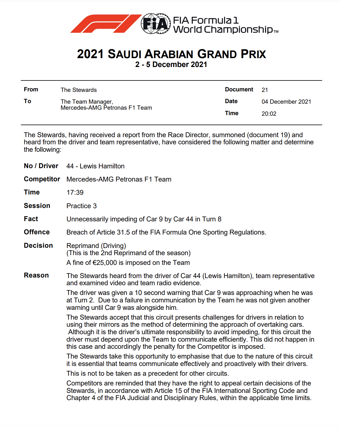 根据FIA官方消息,梅赛德斯车手因在FP3期间阻挡哈斯车队的马泽平遭到训诫。同时,梅赛德斯车队因未能提供有效信息被罚款25000欧元。