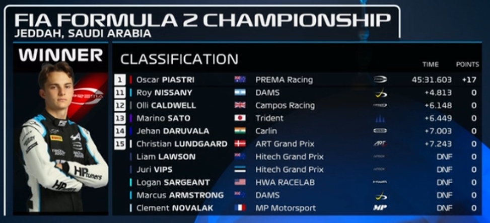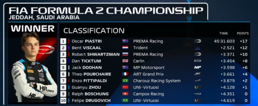 在刚刚结束的F2沙特站第二次冲刺赛中,周冠宇的主要竞争对手皮亚斯特里夺得胜利,并做出最快圈速,拿满17分,继续扩大了积分榜的领先优势。从第17位起步的周冠宇躲过了不少混乱场面,最终以第8名完赛,取得了1个积分。