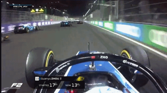 第6圈,维普斯在大直道追尾德鲁戈维奇,前翼卡在了轮胎下方,导致1号弯刹车时严重锁死。最终维普斯把赛车停在了赛道上,退出了比赛。周冠宇上升至全场第12位。