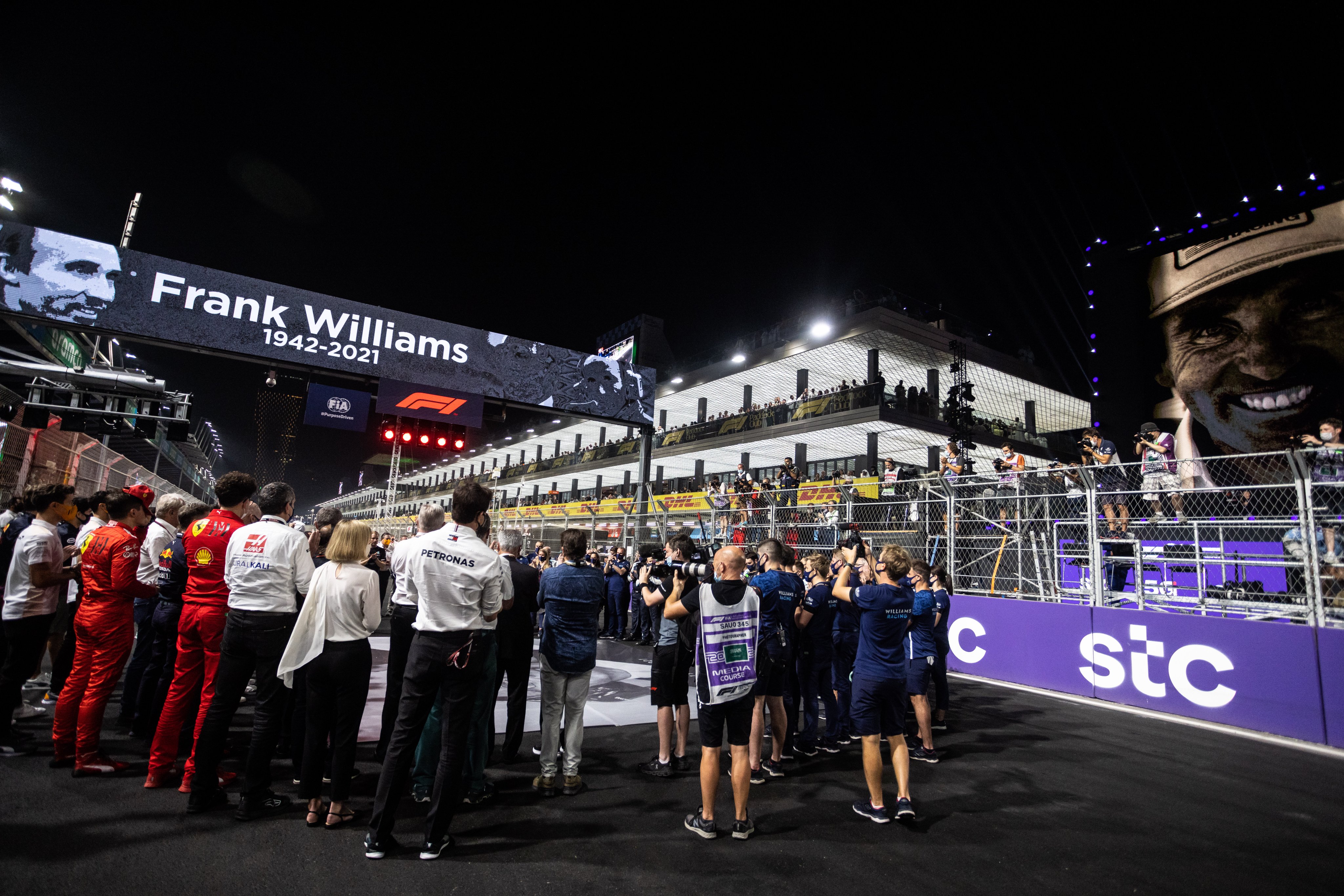 F1沙特阿拉伯大奖赛正赛前,围场全体成员聚集在发车区,为26号逝世的威廉姆斯车队创始人弗兰克·威廉姆斯爵士默哀一分钟,纪念F1中这一不朽的传奇人物。